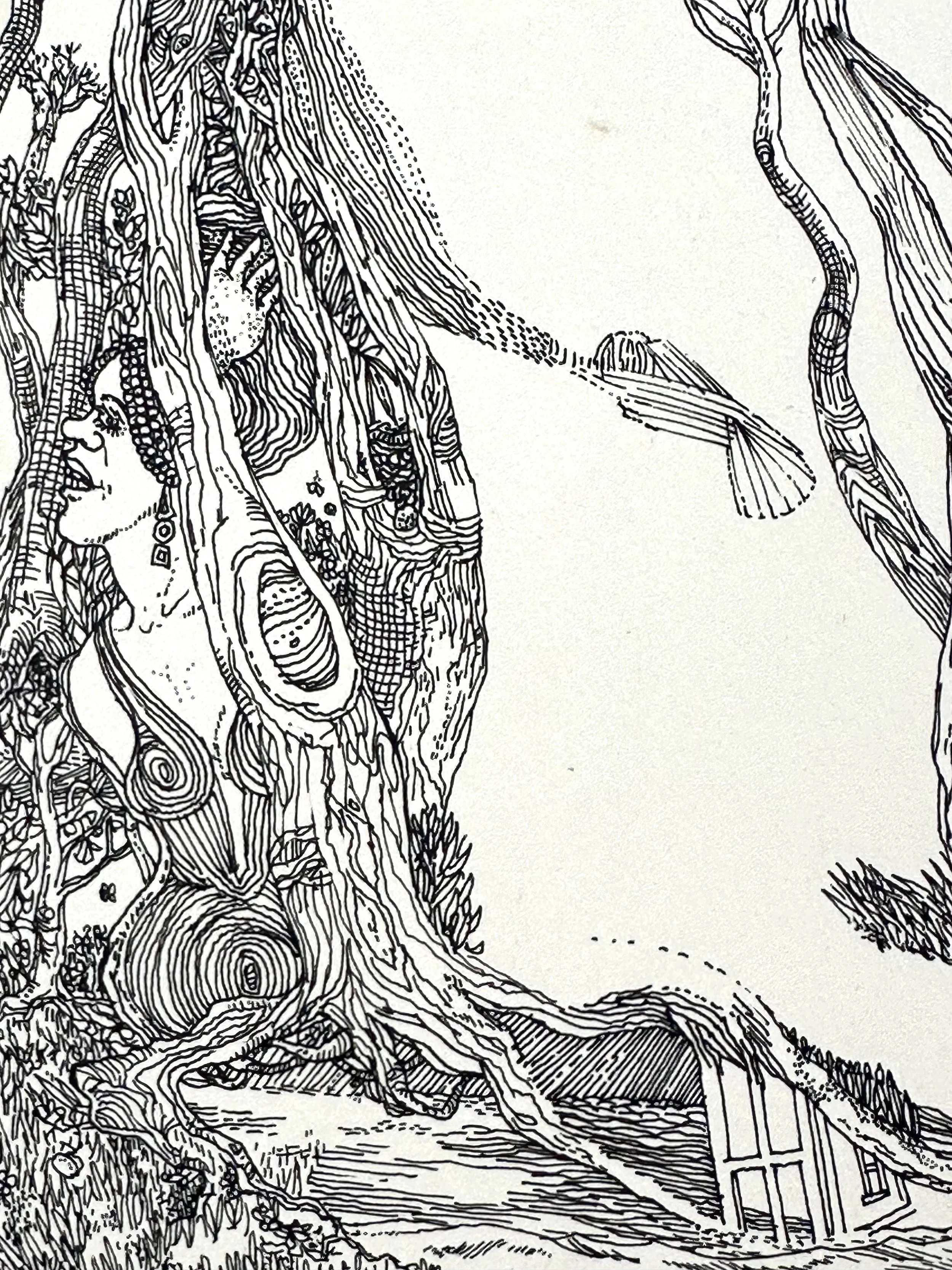 During his childhood, one of the only books in the Ayers household was an illustrated Bible. The images within had a profound effect on the themes and subjects that would appear in his adult work. Figures in an Ayers’ drawing often seem trapped in a narrative of loss and redemption. Powerful women loom large in the drawings: they suggest the female role models his journals record in early life. The drawings can sometimes convey a strong sense of conflict, and at other times, harmony. Nature and architecture seem to have an antagonistic relationship that is, ironically, symbiotic.
